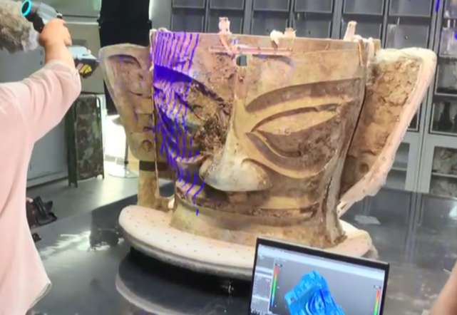 ▲使用智能手持式藍色激光掃描儀掃描寬1.38m的青銅大面具