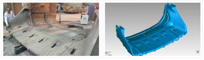 客戶使用傳統卡尺測量建模的方法對挖斗進行逆向建模,經常會遇到諸如測量速度慢、曲面測量不準確、無法對復雜曲面進行 測量等問題,建模很大程度取決于工程師的感覺,不可能做到1:1還原??蛻粝Mㄟ^三維測量,解決建模精準度和建模規范化的 問題。