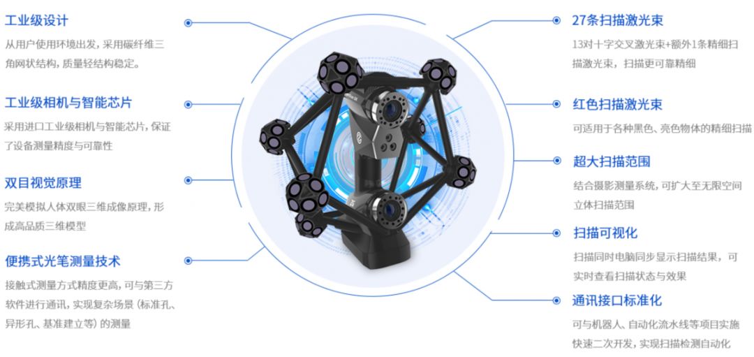 【適用領域】:質量檢測與控制、逆向設計、數字展示、汽車制造、模具制造、航空航天、重工機械、醫療健康、3D打印、教 育科研、VR·AR等;