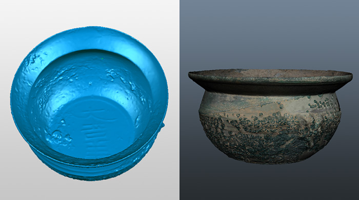 2、后期對文物外觀拍照,通過ArtMapping軟件將點云與影像自動配準融合,可以迅速得到單體文物帶紋理模型,即可還原文物的真實外觀。